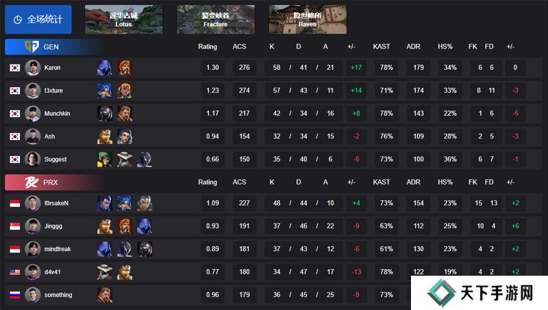 2025 VCT 太平洋联赛第一赛段,小组赛Alpha组,GEN对阵RPX。图一GEN选择莲华古城,Karon的幽影表现出色砍下24杀和287 ACS,GEN上下半场攻守俱佳、稳扎稳打,以13-10先
