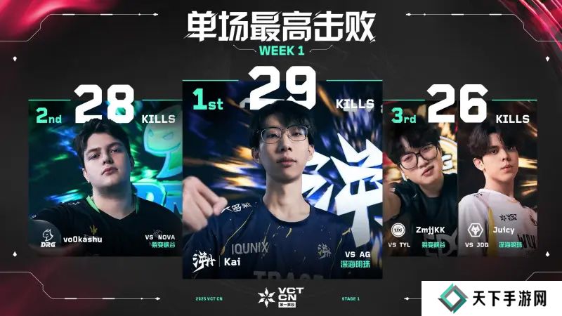 2025 VCT CN联赛第一赛段第一周最佳数据排行公布,本周最亮眼的数据分别是以单场维度统计的击败数、平均每回合伤害以及精准击败率。