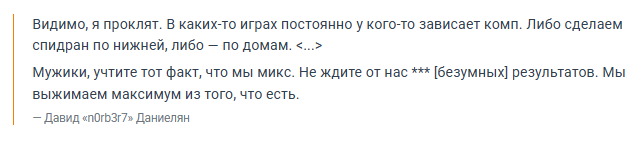 n0rb3r7赛前谈及Roler Coaster:“看来我是被诅咒了。比赛里总有人电脑卡顿。要么在败者组速通晋级,要么直接回家拉倒……兄弟们,别忘了我们是临时拼凑的队伍。别指望我们能打出什么成绩,我们已经在现有条件下做到极限了。”