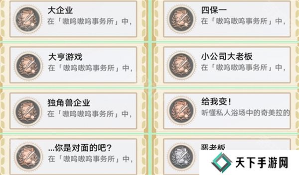 3.大企业、四保一、大亨游戏、小公司大老板、独角兽企业:这些成就都是在“嗷呜嗷呜事务所”活动中必定能获得的成就。