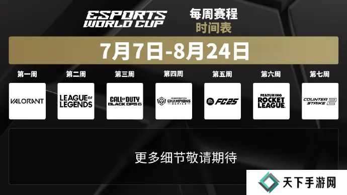 EWC电竞世界杯官方发布2025年七周赛程表,赛事7月7日开赛至8月24日结束,详细赛程如下: