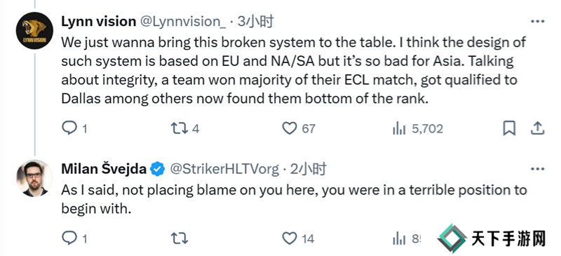 而LVG则回复道:“我们只是想把这个有缺陷的系统摆到台面上来讨论。我认为这样的系统设计是基于欧洲、北美和南美的情况,但它对亚洲来说实在太糟糕了。说到诚信问题,有一支战队在欧洲挑战赛(ECL)的比赛中赢下了大部分场次,获得了参加达拉斯赛事的资格等等,现在却发现他们在排名中处于垫底位置。”