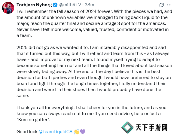 “2024年的下半赛季将成为我永恒的回忆。面对阵容重组和诸多未知因素,我们最终成功带领Liquid重返Major,闯入八强并为美洲赛区锁定第三阶段席位。从未有任何团队让我如此强烈地感受到被接纳、被重视、被信任,也从未有过这般充沛的斗志与信心。