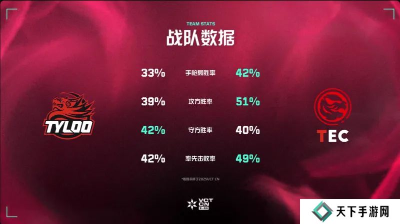 根据VCT CN官方数据统计,TEC在本场赛前的四项核心数据中有三项高于TYL。