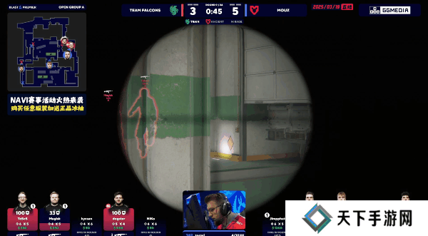 下半场Falcons来到进攻方,手枪局同样甜甜圈夹A,单人防守的Jimpphat仅仅打出一换一后Falcons直接拿下A包点,残局回防的MOUZ随着A大的CT被击杀后慢慢输掉回合。紧接着MOUZ强起前顶中路,kyxsan直接拿下三杀帮助队伍奠定胜局。比分顺势来到6-9。
