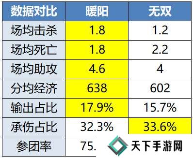 而无双这边,在本赛季依旧是个神鬼莫测的状态。在第二轮的前两场比赛里,各种莫名其妙的站位频送掉点,KDA一路下滑至打野榜的第16位,和深巅、小等风、句号这三位同坐一桌,场均死亡数更是力压句号来到了打野位的第二。今晚对位暖阳,如果无双仍是前两场那种状态的话,济南RW侠本轮基本就走远了。