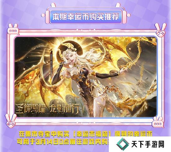 在集市夺宝中购买【幸运币福袋】得到的幸运币,可用于3月14日0点前往和平精英游戏内购买【圣域龙灵】以及其他神装、载具皮肤等。