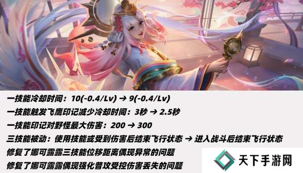 ①一技能全期缩短1秒,一技能触发印记减少冷却下调0.5秒,现在娜可露露后期满冷却可以无缝打出3132A1A连招。