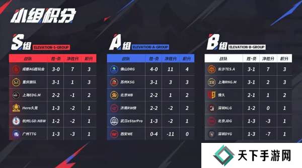 济南RW侠在上周又一次开启了他们经典的“让二追三”剧本,在此前大场0-2陷入绝境后,上周连续两场在对手先拿赛点的情况下打满五局完成翻盘,拿到了一波两连胜,将自己的排名从A组第五提高到了第四,暂时脱离了A/B卡位赛的风险。但目前2胜2负却只有-2净胜分的战绩,想争A2去打S/A卡位赛还是比较困难的: