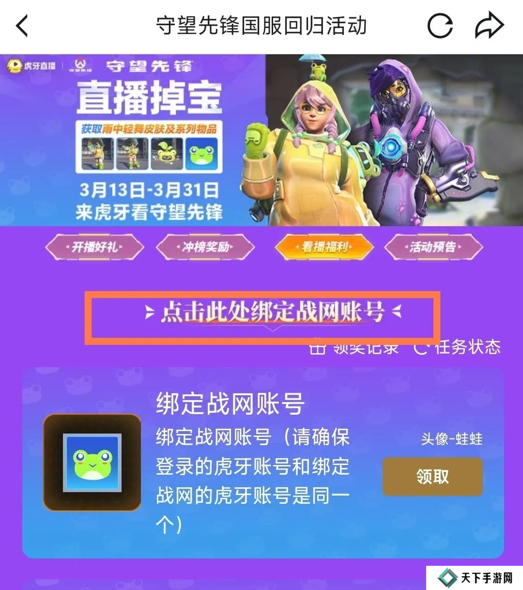 >进入活动页面后,点击“此处绑定战网账号”,完成绑定操作。