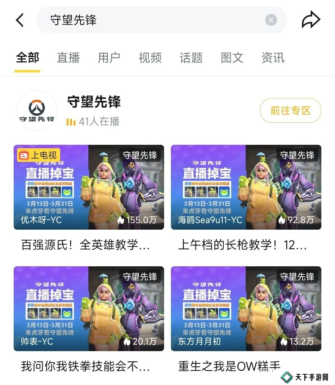 > 打开斗鱼App,搜索“守望先锋”,进入专区。
