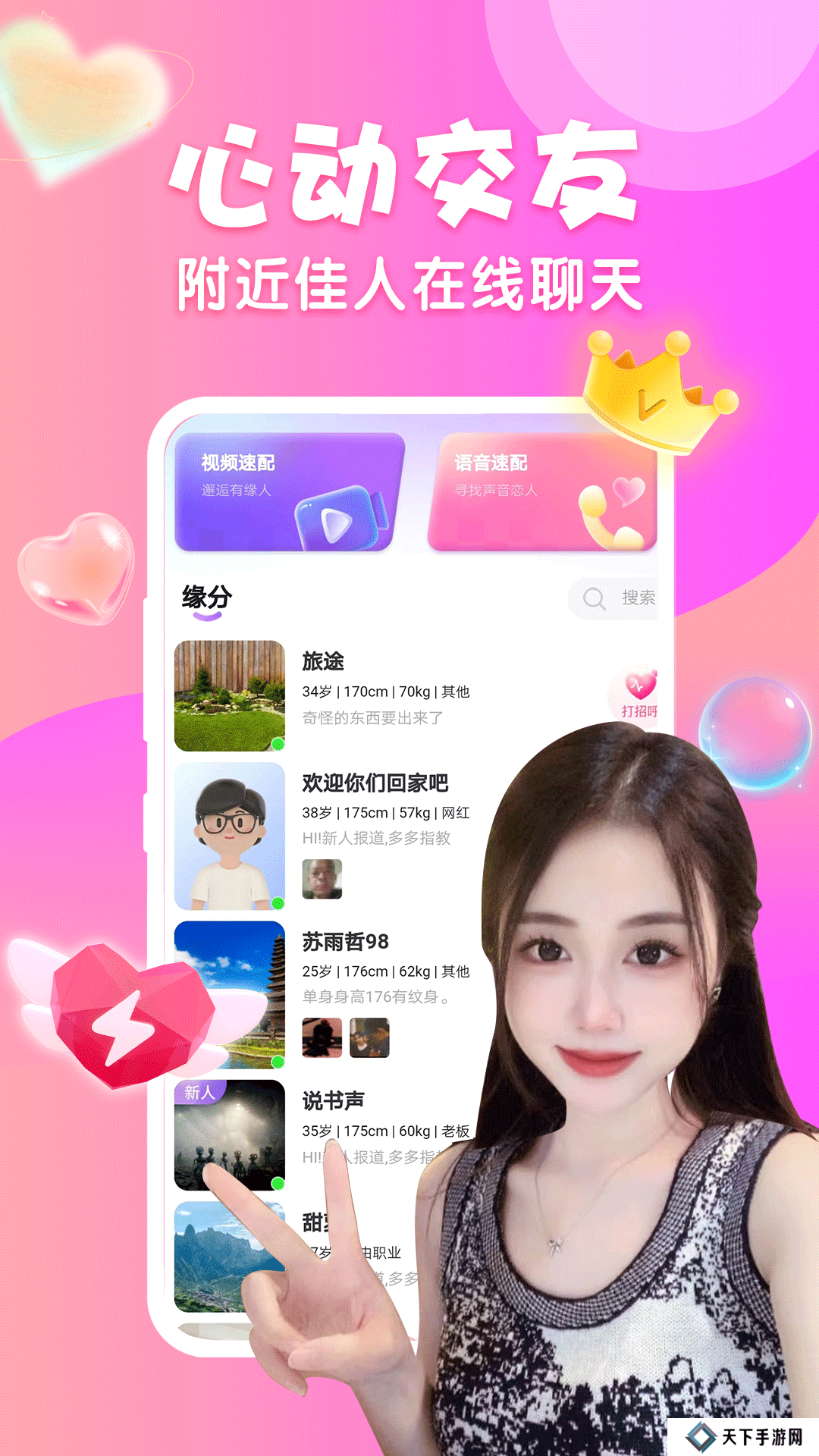 可甜交友app是一款线上交友软件,西门手游网为用户提供可甜app最新安卓版,可甜app中能够帮你认识许多有趣的人,让你在软件中可以快速找到自己喜欢的人,帮你快速摆脱单身的现状,并且还有动态广场可以让用户发表自己的动态,分享自己的生活,如果对可甜app这款软件感兴趣的话就快下载吧!