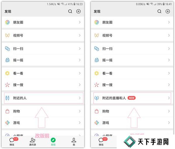 二、发现页改版打开微信点击底部的【发现】,将会看到【附近的人】变成【附近的直播和人】,新增了视频和直播功能,里面的视频和直播,都来自于视频号哦。