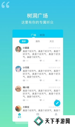 1、平台为广大用户提供了一个非常好的树洞方式,用户们可以在这里畅所欲言,随意抒发心中的苦闷,不用担心自己的信息被泄露;