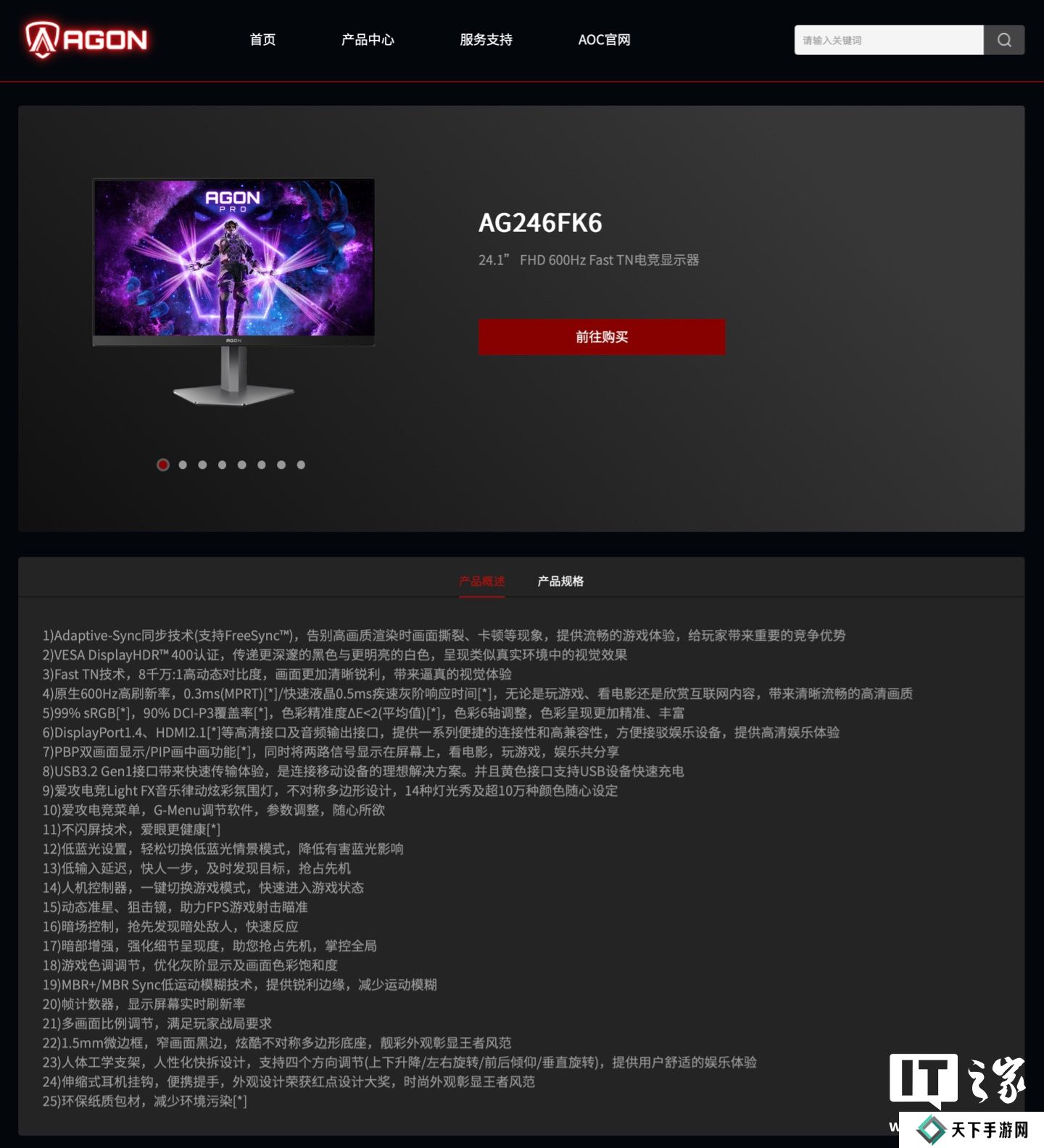 本站 3 月 16 日消息,继微星、卓威后,AOC也宣布推出一款搭载600Hz面板的“AG246FK6”24.1英寸1080P 显示器,并透露该产品将在国内销售,不过价格方面暂未公布,国行官网的“前往购买”按钮实际上无法点击。