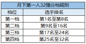 (2)在64强比赛结束后,进入月下第一人每个门派的32强少侠将根据复赛成绩进行排名,排名后将分为4档,分档规则如下: