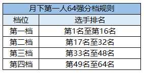 (1)在复赛结束后,进入月下第一人每个门派的64强少侠将根据复赛排名分为4档,分档规则如下: