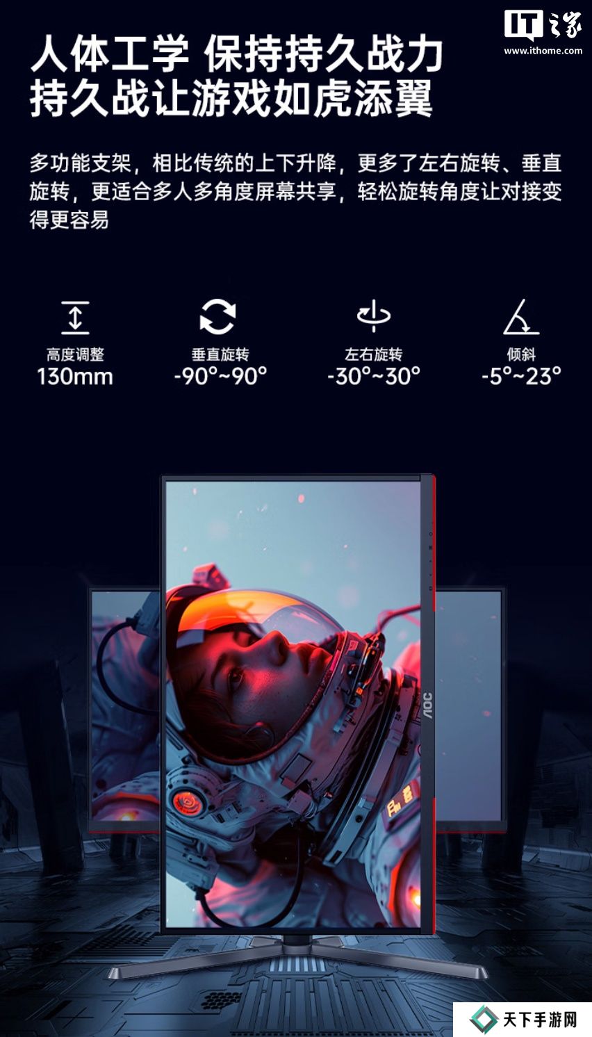 这款显示器支架支持倾斜 / 升降 / 旋转,显示器本体支持VESA 100x100mm 壁挂,提供 HDMI 2.1、DP 1.4 和3.5mm音频接口。