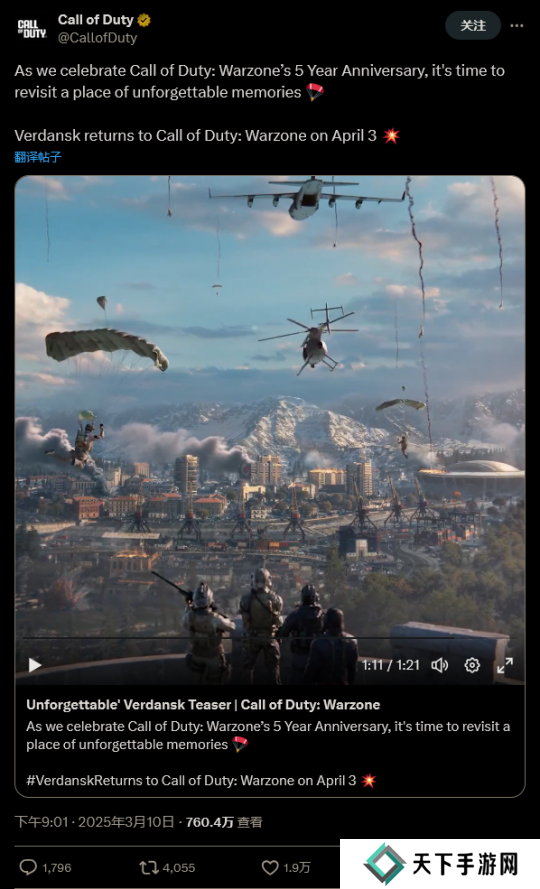 在社交媒体上官方写道:“在我们庆祝《使命召唤:战区》5 周年之际,是时候重温这个令人难忘的地方了。”