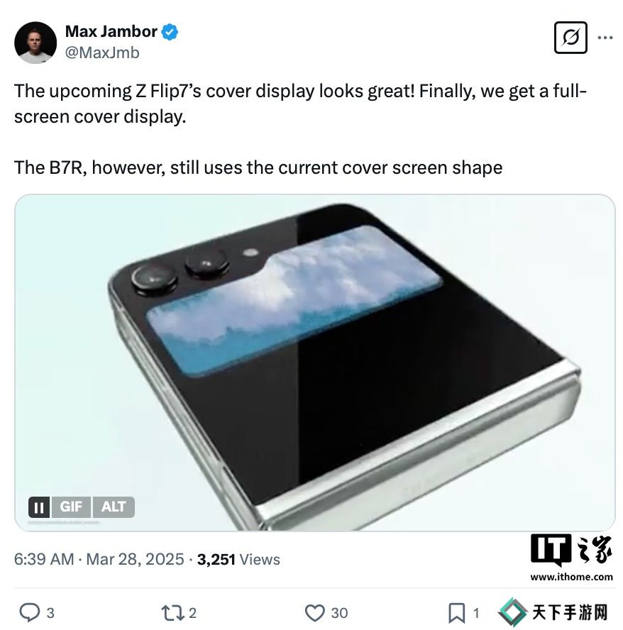 本站 3 月 28 日消息,综合消息源 Max Jambor 和 OnLeaks 爆料,三星Galaxy Flip7小折叠手机将采用“全面屏”风格外屏,整体风格类似联想的moto razr 50 Ultra手机,另有一款 Galaxy Z Flip FE 机型将延续目前Galaxy Flip6的“文件夹”风格外屏设计。