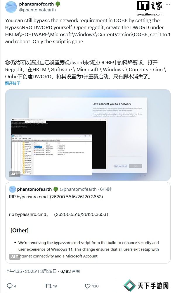 该绕过命令已在最新 Dev 及 Beta 测试版中失效,预计微软会在未来数周内将其推广至正式版本。