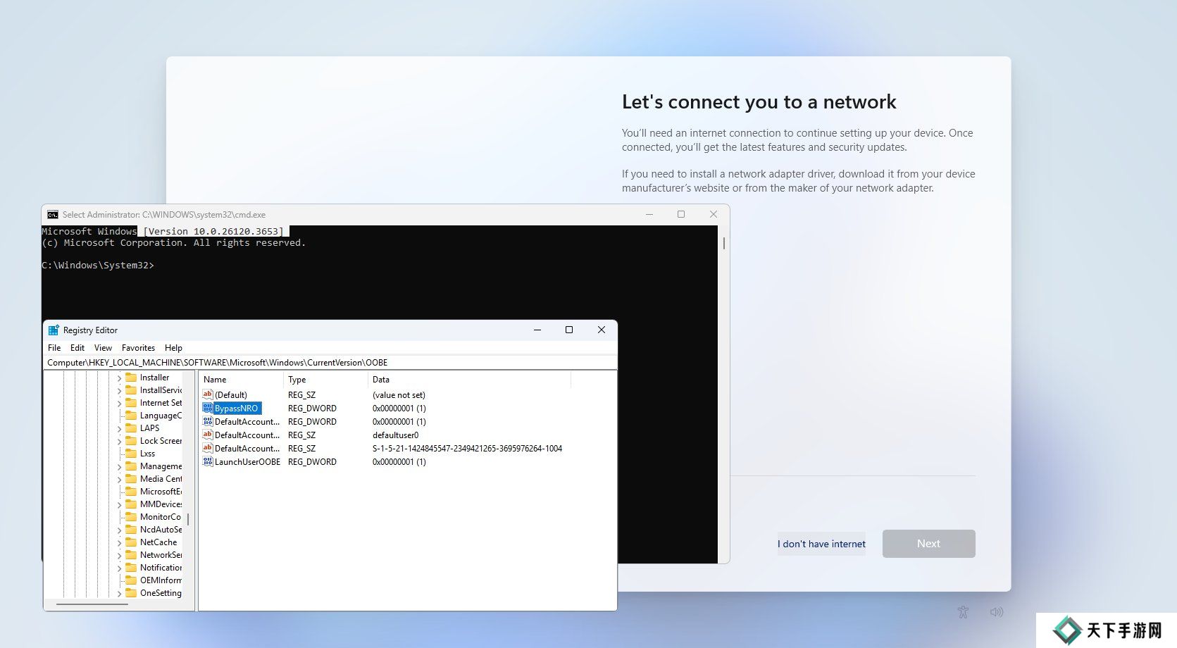 本站提醒,用户仍可通过修改注册表重新激活该功能,我们可以在 OOBE 初始化阶段按下 Shift+F10 调出命令提示符并输入以下命令: