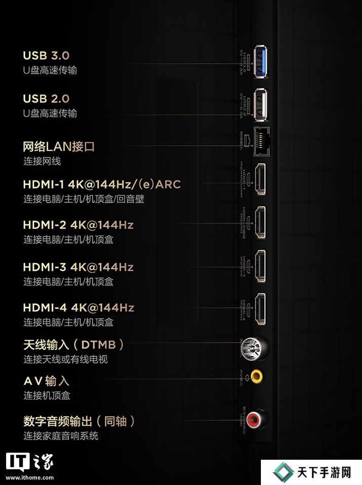 接口方面,系列电视提供4个 HDMI 2.1接口、1个 USB-A 3.0接口、1个 USB-A 2.0接口、天线输入接口、AV输入接口、数字音频输出接口。