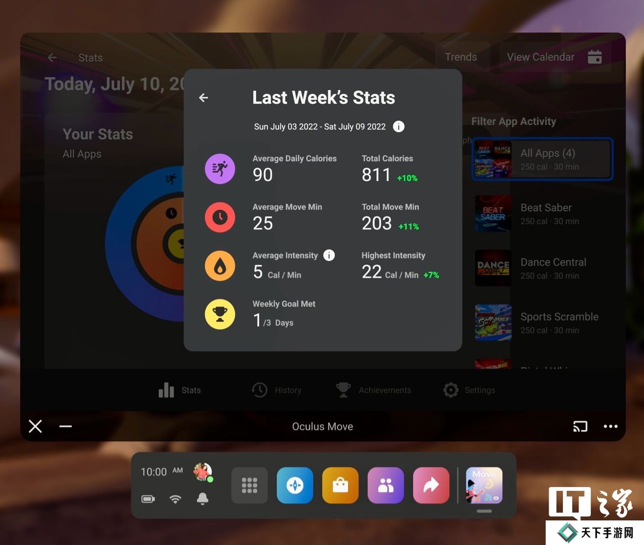 本站注意到,这款App的主要作用就是展示用户使用VR头显时燃烧的卡路里等内容,用户可以自行在App中设置每天、每周运动目标。此外用户在运行其他游戏应用时,也可以呼出 Quest Move 应用托盘(叠加层)查看健康数据。