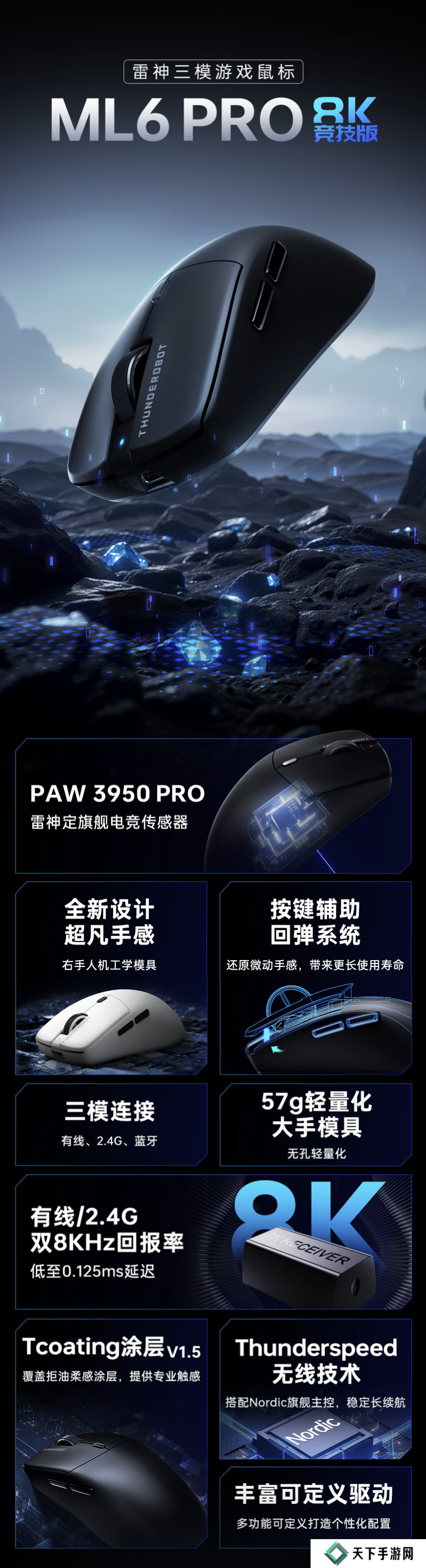 规格方面,该鼠标配备PAW3950 PRO传感器,支持双8KHz回报率,同时搭载Thunderspeed无线技术及 Nordic 电竞主控,内置 400 毫安时电池,至高拥有 110 小时续航。