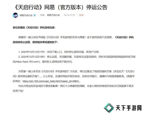 2024年10月14日17时,游戏将关闭下载入口,同时停止游戏充值、新用户注册