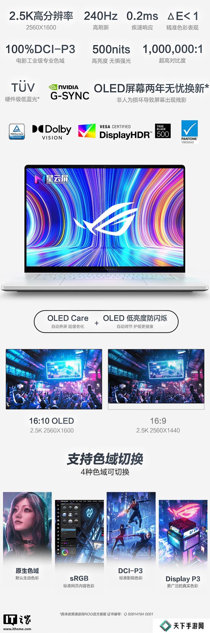 该机配备一块16英寸2560x1600分辨率240Hz OLED面板,响应速度0.2ms,支持500尼特色彩,动态对比度1 百万:1,覆盖 100% DCI-P3色域。