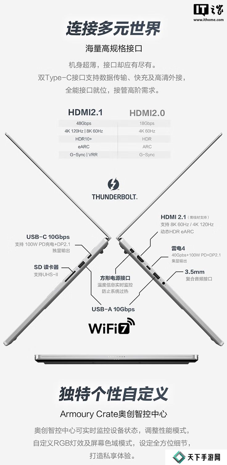 I/O方面,该机左侧配备1个 HDMI 2.1接口、1 个雷电 4 接口、1个 USB-A 10Gbps接口、1个 3.5mm音频接口;右侧配备1个 USB-C 10Gbps接口、1个 USB-A 10Gbps接口、1个 SD卡读卡器。