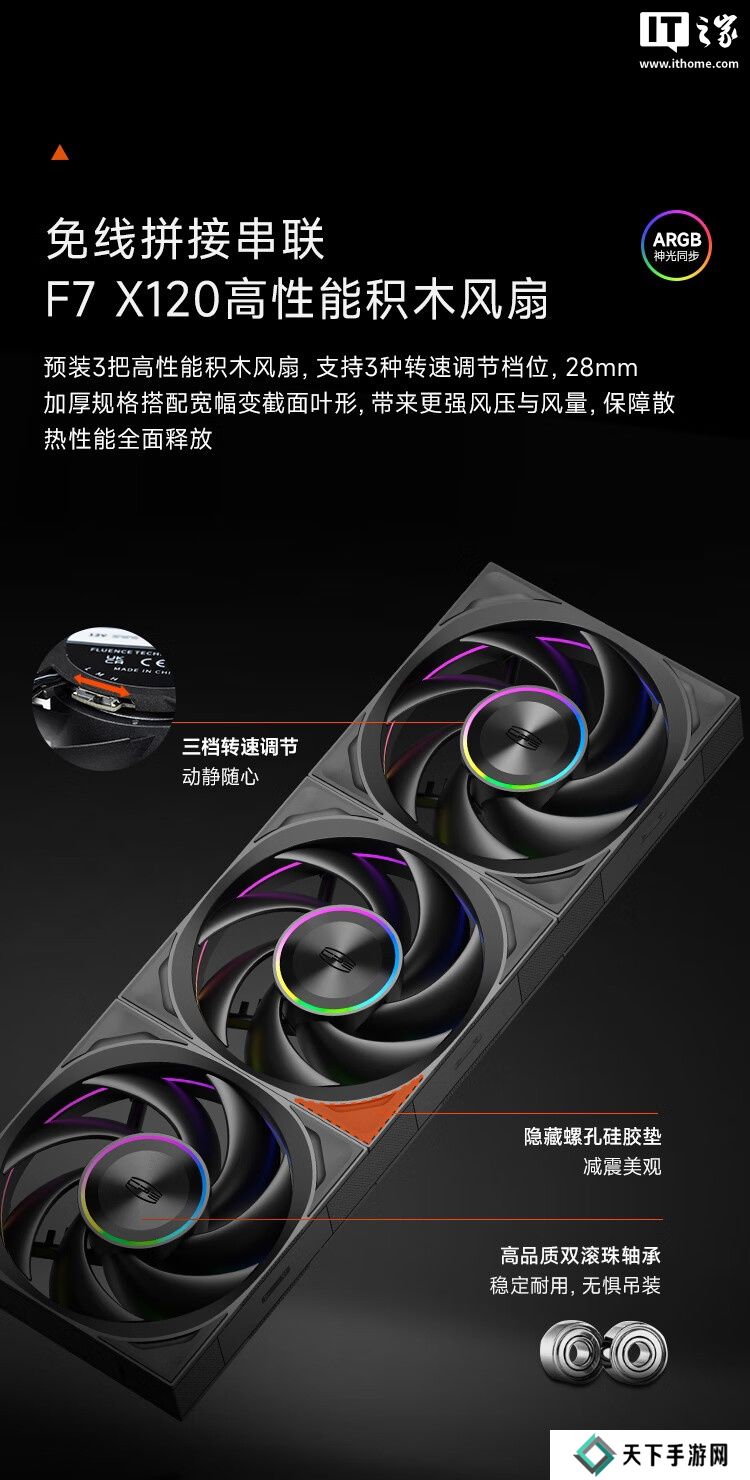 此外其标配三颗光翼 F7 X120 风扇,各扇体间采用积木拼接 + 卡扣固定的免线串联结构。该风扇采用 12028 加厚规格,搭载双滚珠轴承,支持三档转速调节(3000 / 2200 / 1500 RPM)。