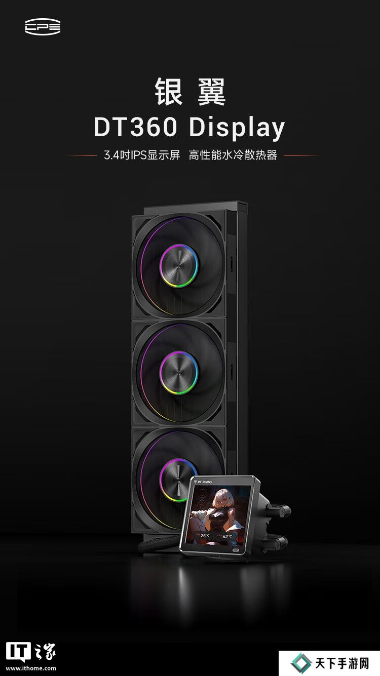 银翼 DT360 ARGB Display 的方形冷头屏幕尺寸为 3.4 英寸,分辨率为 480×480,支持 60Hz 刷新率,可显示 24 位真彩,能通过控制软件自定义显示内容。