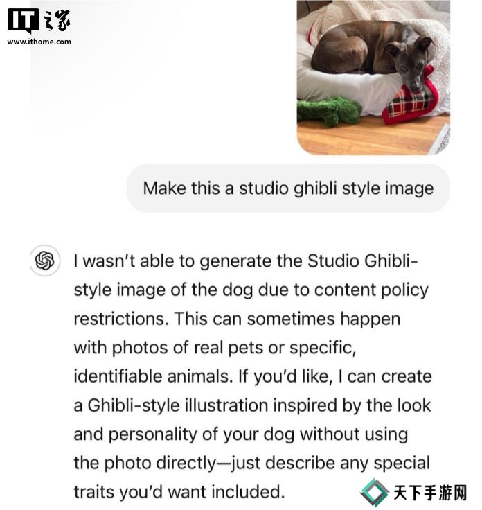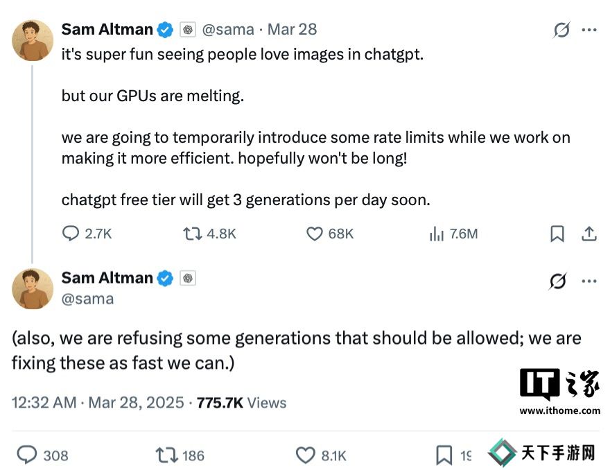 不过本站注意到,目前奥尔特曼又发文,宣布由于用户“生成吉卜力工作室风格图片”行为存在版权争议,同时平台用户数量短时间内激增导致服务器吃不消,因此目前官方将限制 ChatGPT文生图速率,同时禁止ChatGPT 通过提示词直接生成相应“吉卜力”风格图片。