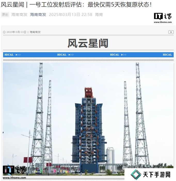 本站 3 月 14 日消息,3 月 12 日 0 时 38 分,海南商业航天发射场一号发射工位成功首发。专家初步评估:只需 5 天修复就可以恢复到发射前的原状态。