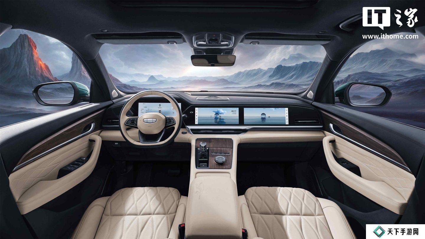2025 款星越 L・东方曜今朝版车内继续配备 12.3 英寸全液晶仪表,中控和副驾位置则配备了 12.3 英寸双联屏。副仪表台采用了最新的设计布局,取消了中央空调出风口下方的实体按键,换装了水晶材质的电子换挡杆和功能旋钮。此外,车辆还新增了一列实体物理按键,并使用木纹饰板装饰,同时增加了前方储物格。