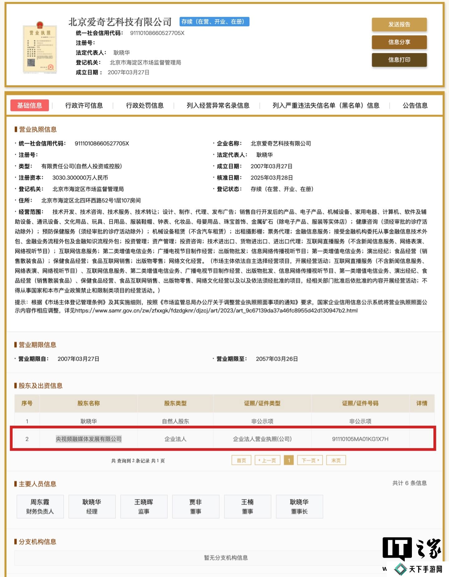 本站 3 月 30 日消息,国家企业信用信息公示系统显示,今天北京爱奇艺科技有限公司股权发生变动,新增央视频融媒体发展有限公司,持股比例占 0.9999%,公司法定代表人、董事长耿晓华持股比例从 100% 降为 99.0001%。